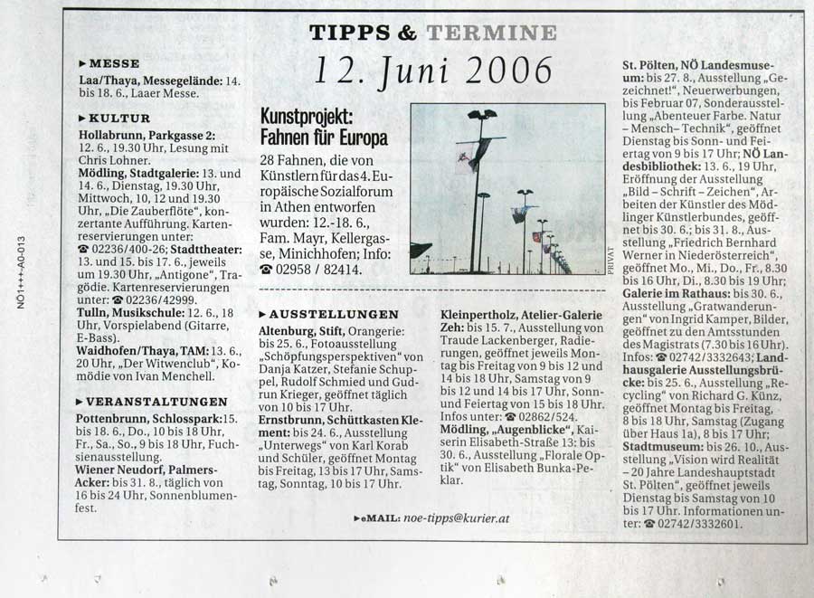Krone NÖ - 2006-06-21 KURIER - TopTipp 2006-06-12 NÖN - 2006-06-19 Kultura-Extra (online) - 2006-07 e-motionArtspace (online) - 2006-07 Kulturvernetzung NÖ (online) - 2006-06-10
