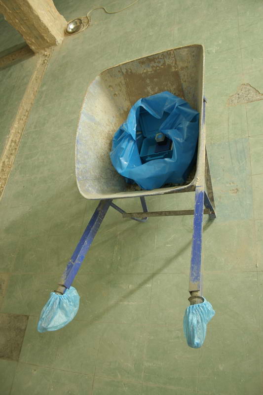 This was neither curated nor made by an artist. The bird was the only one of the birds (many birds populate this hotel-building when empty) that did not fly away when people came in. The curators saw this bird several times sitting on top of an old air-conditioner while preparing the exhibition. Just before installing the artworks the bird was found haning below that box - and the reason why it hadnt been flying away was clear. |